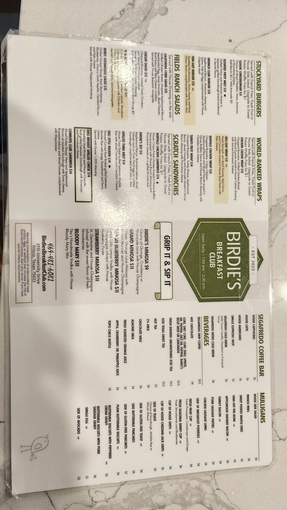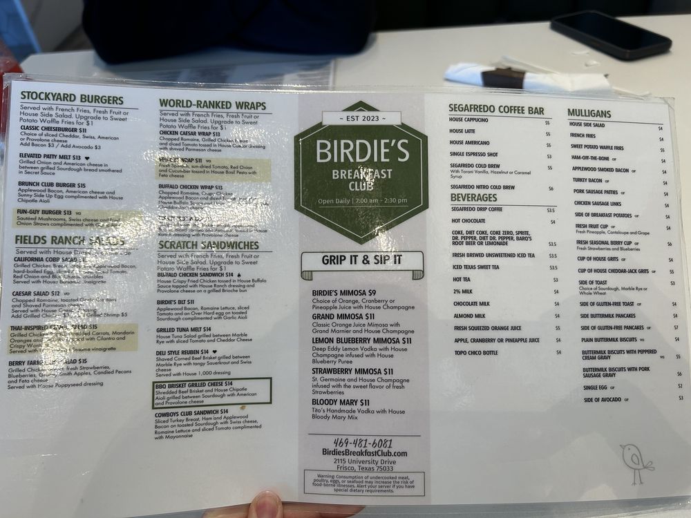 Birdies Breakfast Club located in Frisco, TX, is a top-rated breakfast and brunch spot known for their quick and friendly service. Customers rave about the generous portions, with highlights like the Mediterranean toast, potatoes, bacon, chicken and waffles, and specialty lattes like the tiramisu latte. The ambiance is described as light, refreshing, and modern, adding to the overall dining experience. With options for takeout and QR code menus available, Birdies Breakfast Club is a convenient choice for families and individuals alike. Despite weekend crowds, the quality of the food and service remain consistently high, making it a go-to spot for a satisfying brunch experience.